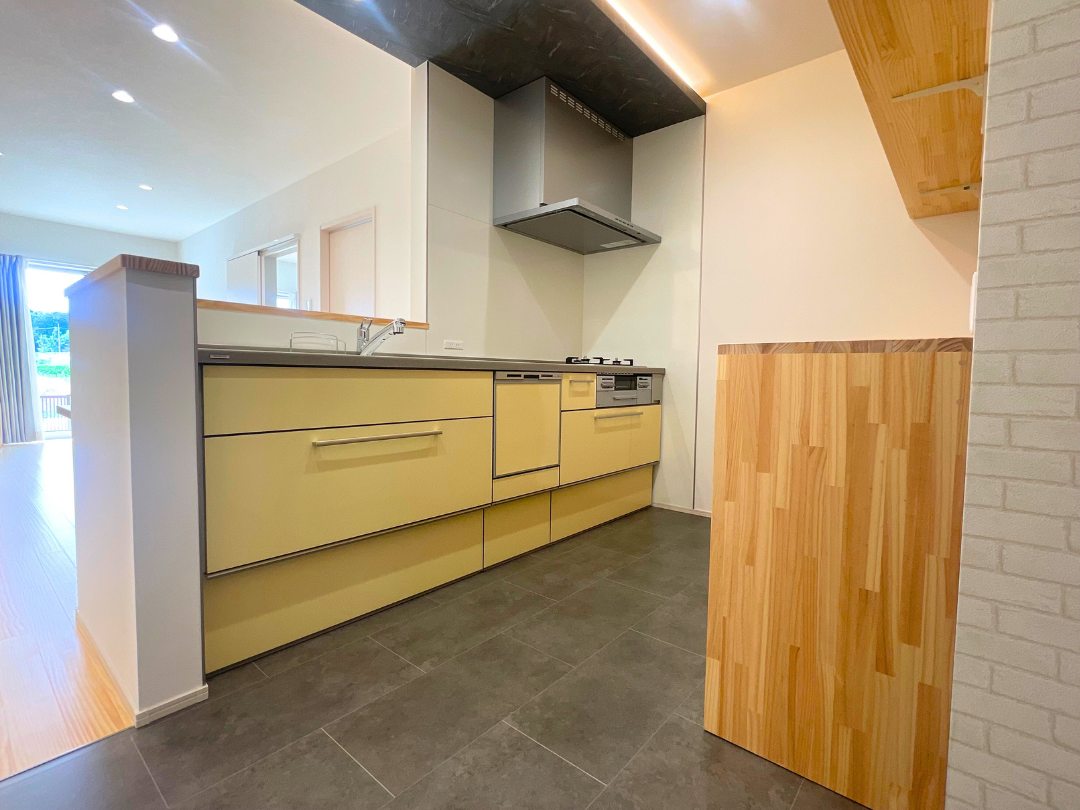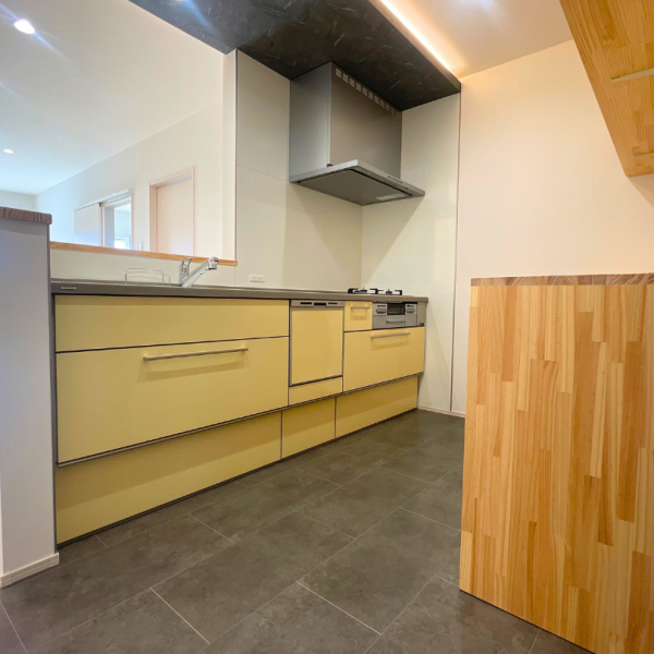 キッチンは淡いイエローで統一し、毎日の家事が楽しくなる明るい空間に。